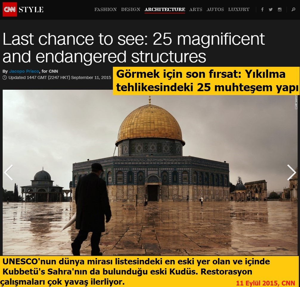 11 Eylül 2015 tarihli CNN haberinde Kudüs'te bulunan Kubbetü's Sahra yıkılmadan önce görülmesi gereken 25 yapı arasında anılıyordu.