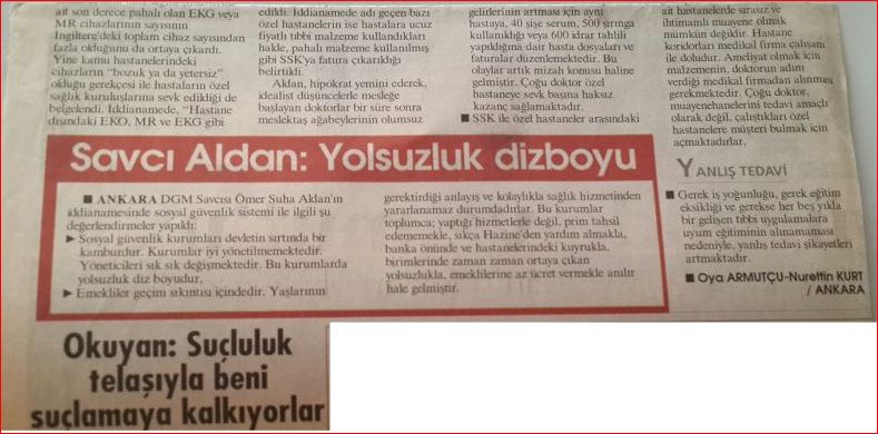 Hürriyet devam ediyor: SSK'da kobay olarak kullanılan 6 hasta öldü. 37 Sanığın hesaplarına tedbir. Neşter savcısı Ömer Süha Aldan, iddianamede kamu hastanelerinin “cihazlar bozuk” diye hastaları özel sağlık kuruluşlarına gönderdiğini açıkladı. Aldan, bu yüzden sadece İstanbul'da özel sektördeki EGK ve MR cihazlarının, İngiltere'den fazla olduğunu söyledi.